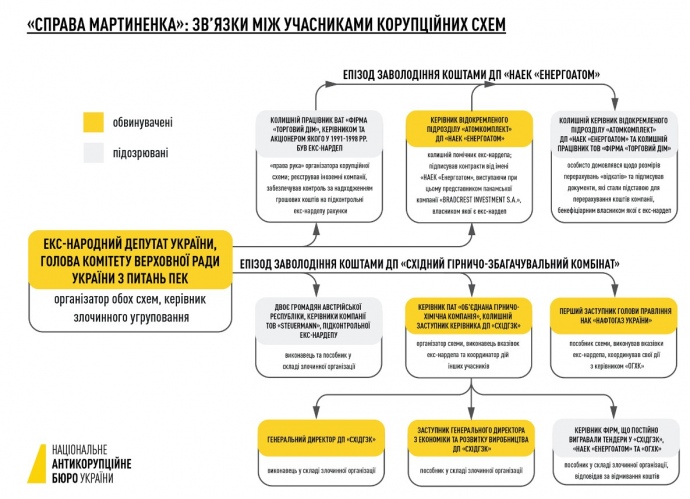 20 апреля 2017 детективы НАБУ и прокуроры САП задержали экс-председателя комитета парламента по вопросам топливно-энергетического комплекса Мартыненко в рамках расследования по факту хищения средств ГП "ВостГОК" при закупке уранового концентрата.
