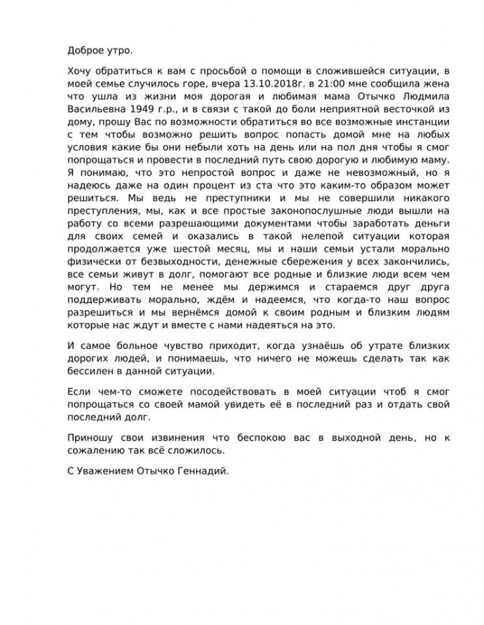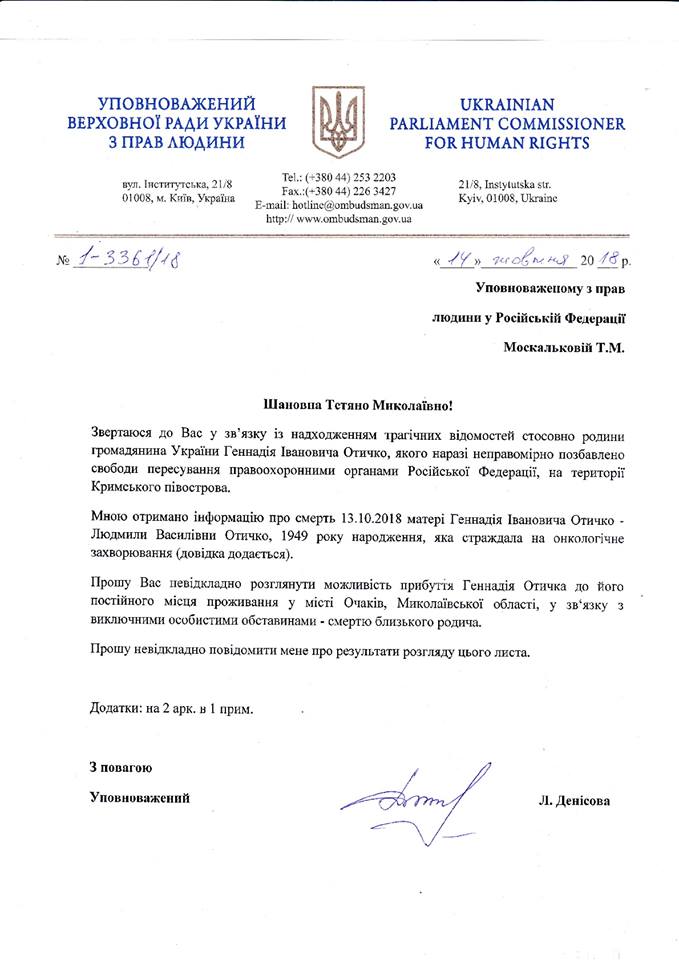 Она также добавила копию своего обращения к Москальковой, где просит рассмотреть возможность возвращения Отычко к его постоянному месту жительства в городе Очаков Николаевской области в связи со смертью матери.