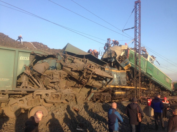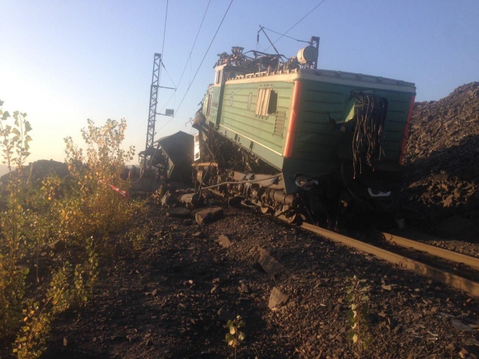 По предварительной информации, у одного из локомотивов не сработали тормоза – и он столкнулся с локомотивом, который стоял на путях для загрузки.