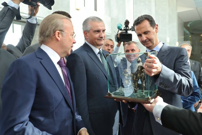 Аксенов подарил Асаду копию «памятника вежливым людям», который представляет собой фигуру российского военного, и посвящен российской аннексии полуострова в 2014 году.
