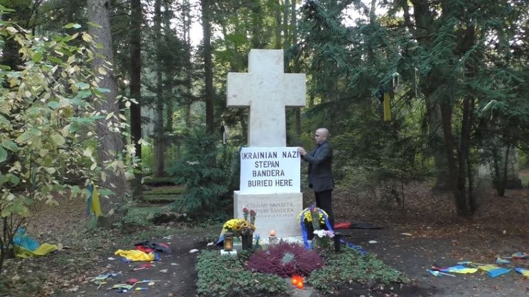 15 октября, в 59-ю годовщину убийства Степана Бандеры агентом КГБ в Мюнхене, пророссийский провокатор и пропагандист Грэм Филипс на кладбище Вальдфридгоф прикрепил к кресту на могиле известного украинца надпись "Здесь похоронен украинский нацист Степан Бандера".