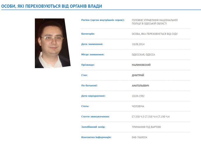 По данным Министерства внутренних дел в разделе лиц, скрывающихся от органов власти, есть Дмитрий Малиновський, который исчез в августе 2014 года.