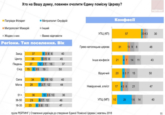 "В среде тех, кто положительно относится к созданию Единой поместной церкви, тенденции поддержки возможных руководителей этого образования похожи: патриарх Филарет пользуется поддержкой 50%, митрополит Онуфрий – 5%, митрополит Макарий – 4%", - говорится в исследовании.