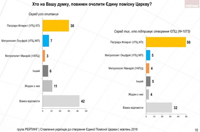 Также отмечается, что патриарх Филарет как возможный глава Единой поместной церкви пользуется наибольшей поддержкой среди прихожан церкви, которую он возглавляет (57%).