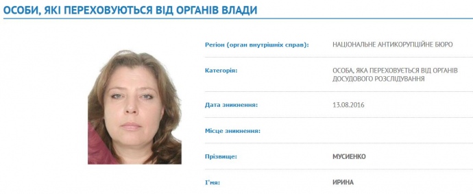 13 августа того же года Мусиенко сообщили о подозрении в совершении уголовных преступлений, а постановлением детектива НАБУ она была объявлена в розыск.