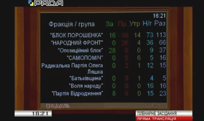 Против санций проголосовали все депутаты "Оппозиционного блока", которые принимали участие в голосовании, внефракционные Евгений Мураев, Яков Безбах, Виктор Бондарь от "Возрождения" и Вячеслав Богуслаев от "Воли народа".