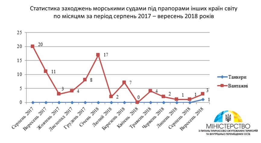 Как сообщили в Министерстве по вопросам временно оккупированных территорий и внутренне перемещенных лиц, количество заходов судов, на которых работает AIS (Automatic Identification System), зафиксировано за период с 1 августа 2017 г. по 30 сентября 2018 года.