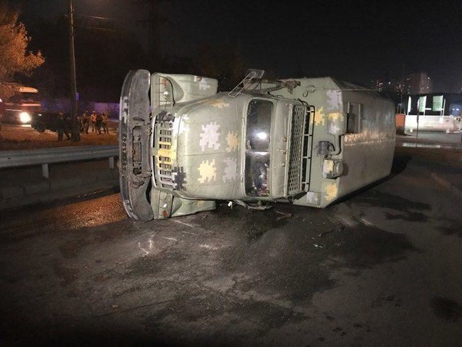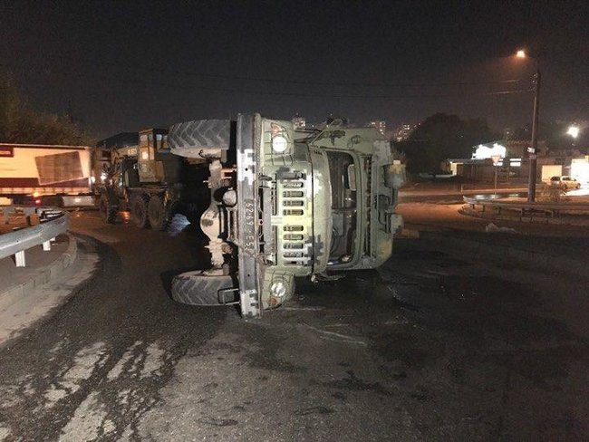 В Киеве возле Дарницкого шоссе перевернулся военный грузовик.