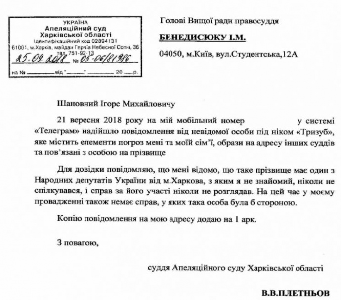 Недавно Плетнев, в числе прочих судей Апелляционного суда Харьковской области, получил на личный мобильный телефон сообщения от адресата "Тризуб" с угрозами и требованием воздержаться от рассмотрения дел, где якобы фигурирует Святаш.
