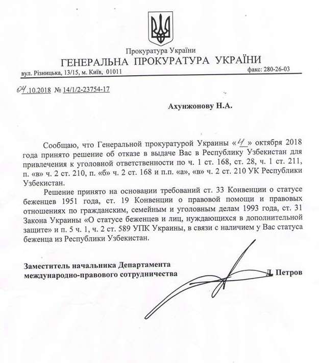 По словам Покальчук, Ахунжонов получил в Украине официальный статус беженца.