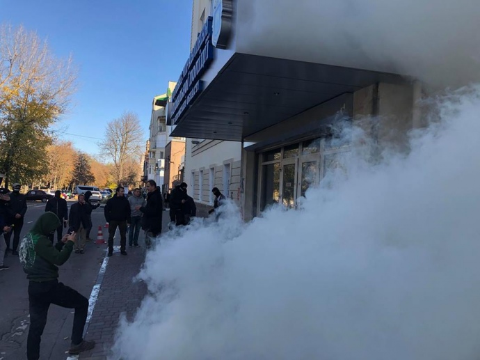 Среди митингующих, в том числе, были представители праворадикальной группировки С14. Они зажгли файеры и разрисовали стены и вход в управление полиции.