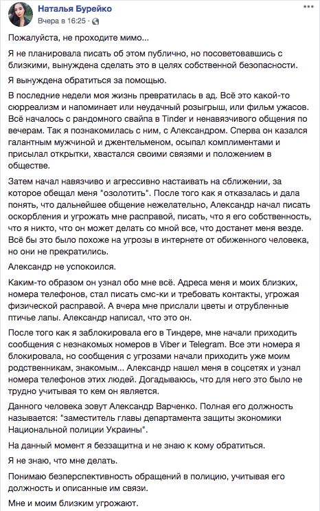 7 ноября в аккаунте Facebook Натальи Бурейко появился пост с обвинениями в сторону сотрудника Нацполиции Александра Варченко.