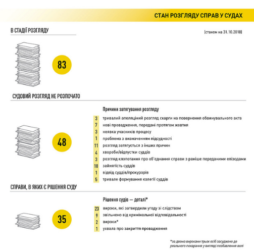 В Национальном антикоррупционном бюро Украины заявили, что из числа 166 уголовных производств, в которых по состоянию на конец октября 2018 года завершено досудебное расследование, в 48 делах даже не произошло подготовительное судебное заседание.