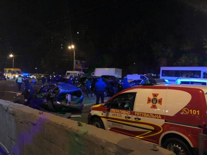 Местное издание Dnepr.info сообщает, что в ДТП столкнулись автомобили BMW, Subaru, Fiat, Skoda, ВАЗ, Славута, Toyota, Nissan, Kia и BMW.
