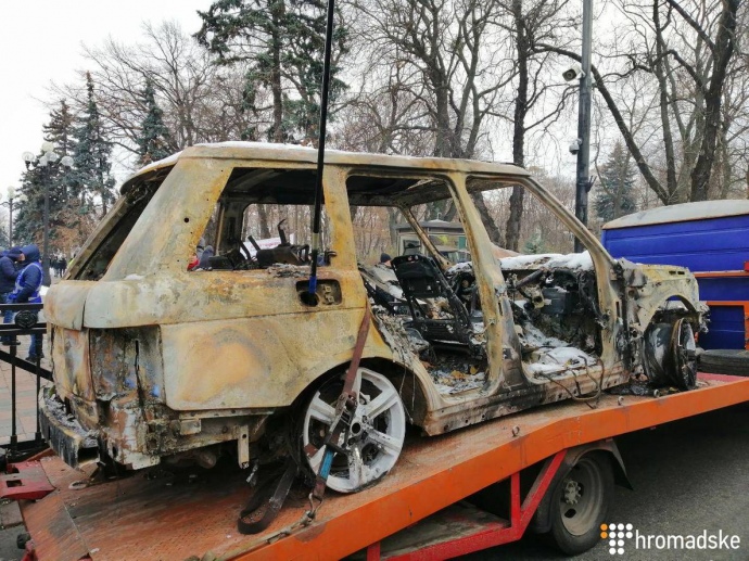Как сообщает "Громадське" на акцию привезли сожженный автомобиль Ярошевича. Ранее он сжег свой Land Rover в знак протеста против принятых законов.