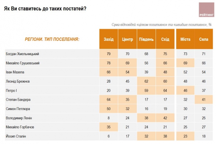 "С другой стороны такие фигуры как Петлюра и Бандера лучше воспринимаются на западе. Зато Хмельницкий и Грушевский одинаково хорошо оцениваются жителями всех частей Украины", - отмечают исследователи.