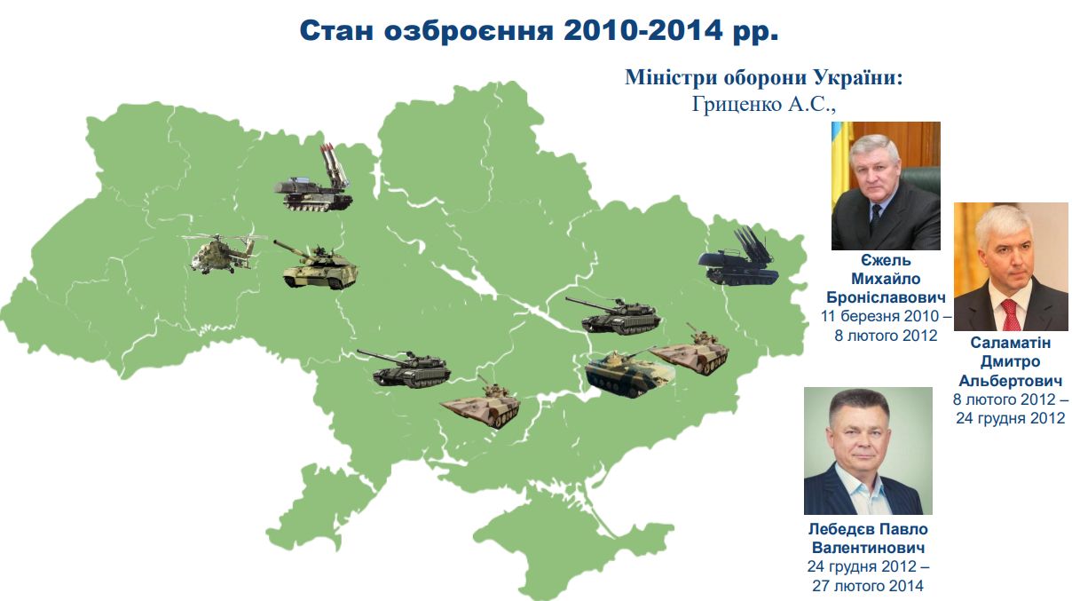С 25 июня 2003-го по 23 сентября 2004 года, при министре Евгении Марчуке, из состава вооруженных сил вывели 286 ЗРК и 286 ПЗРК, 814 БТР / БМП, 263 танка и 86 боевых самолетов.