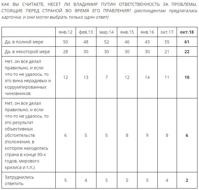 10% полагают, что Путин "все делал правильно, и если что-то не удалось, то это вина нерадивых и коррумпированных чиновников", а 6% – что он "все делал правильно, и если что-то не удалось, то это результат объективных обстоятельств".