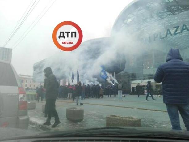 Сторонники националистических движений устроили пикет у столичного торгового центра "Ocean Plaza", зажгли дымовые шашки.