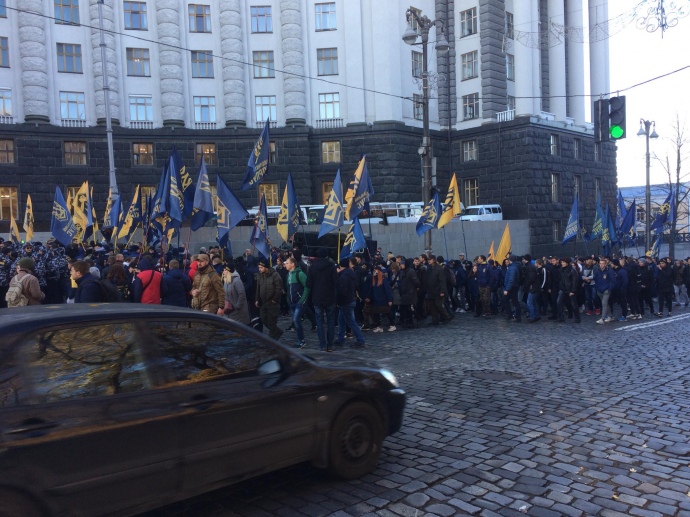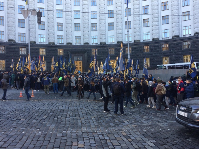 Представители националистических групп с флагами своих организаций пришли под Кабинет министров Украины.