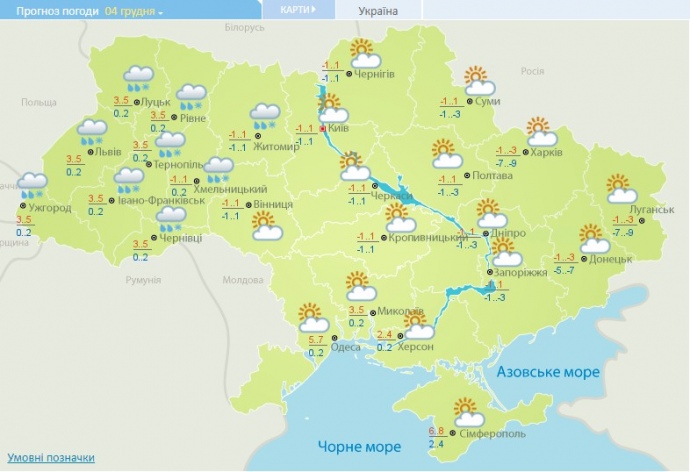 На 4 декабря синоптики прогнозируют в западных областях мокрый снег и дождь, местами гололед, на остальной территории без осадков. Ночью и утром местами туман. На дорогах гололедица. Ветер южный, 5-10 м/с.