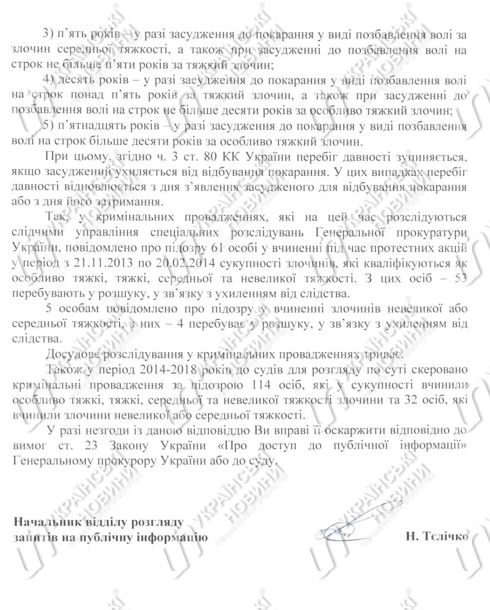 Об этом говорится в ответе Генеральной прокуратуры на запрос "Українських новин".