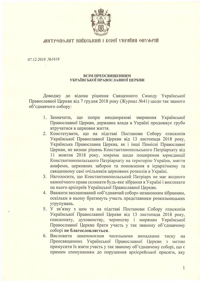 Также Онуфрий, выразил "озабоченность" из-за якобы давления на духовенство УПЦ МП, чтобы заставить их принять участие в объединительном соборе.