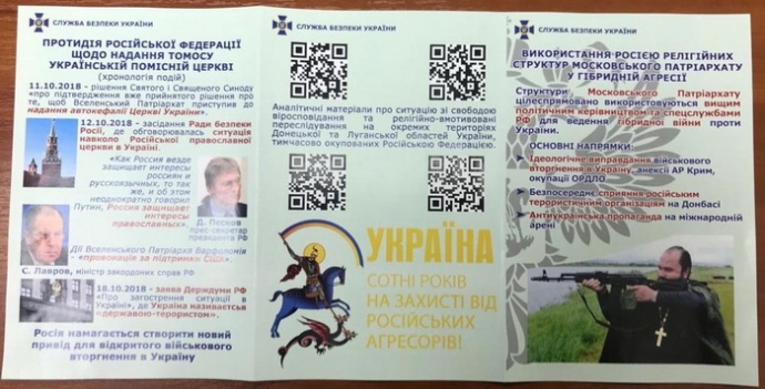 Служба безопасности Украины презентовала серию специальных информационных буклетов, первые два выпуска которых посвящены террористической деятельности спецслужб РФ в Украине и использованию Россией в гибридной войне религиозных структур Московского патриархата.