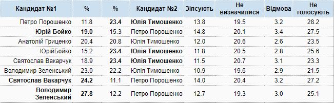 Социологи подчеркивают: "В парах Гриценко – Тимошенко и Зеленский – Тимошенко разница в поддержке между обоими кандидатами – в пределах статистической погрешности, что не позволяет утверждать, какой из этих кандидатов имеет более высокую поддержку во втором туре".