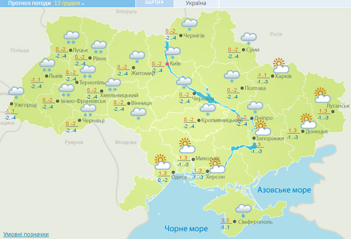 13 декабря на всей территории Украины, кроме восточных областей, Прикарпатья и Закарпатья, ночью прогнозируют умеренный, днем небольшой снег, на дорогах гололедица.