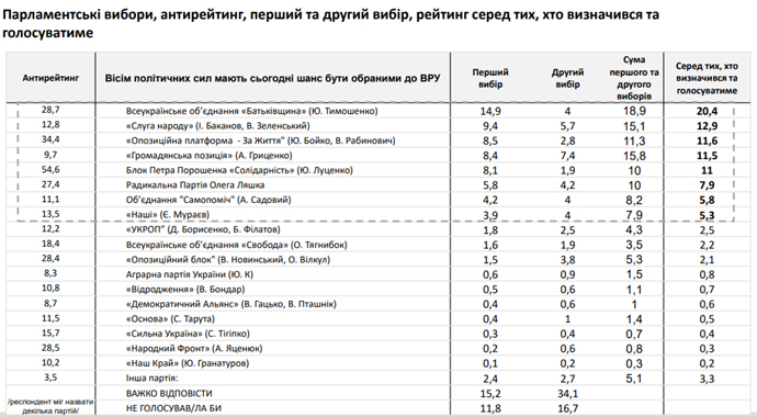 Среди тех, кто определился, за кого голосовать, 20,4% готовы поддержать ВО "Батькивщина", 12,9% – партию, которая еще никак озвучивала готовность участвовать в выборах, "Слуга народа", 11,6% – Оппозиционную платформу "За жизнь", 11,5% – "Гражданскую позицию", 11% – "БПП" Солидарность ".