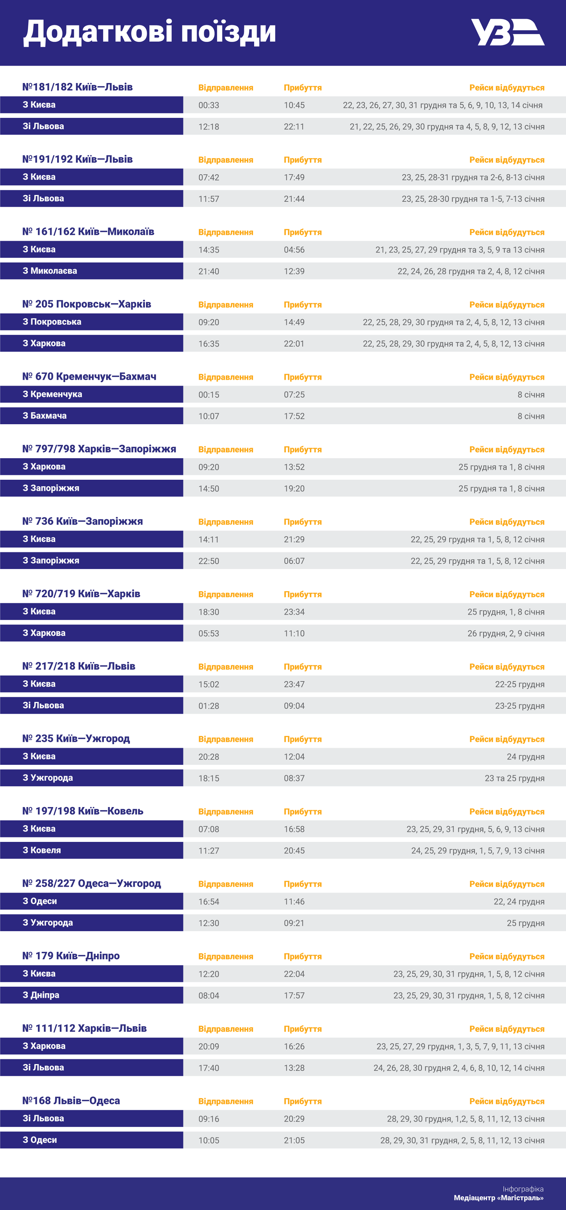 Как сообщили в пресс-центре компании, УЗ назначила дополнительные поезда из Киева в Ужгород, Львов, Ковель и Днепр, и из Одессы - в Ужгород.
