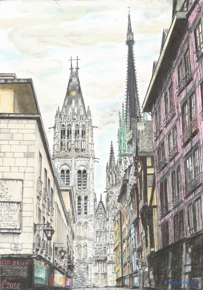Кроме письма коллегам политзаключенный прислал свой новый рисунок - "Руанский собор". Ранее Сущенко уже рисовал его, но по неизвестным причинам рисунок потерялся и не дошел до его семьи. Поэтому журналист решил нарисовать новый.