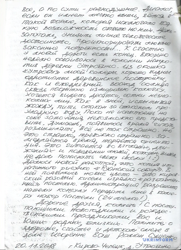 "Пару строк об обыденном. За прошедшее с момента этапирования время пришлось пережить реальный культурный шок, связанный прежде всего не с условиями и "прелестями" перемещения по принуждению (вагон" Столыпин ", антисанитария, тараканы размером со спичечный коробок, вездесущие грызуны всех мастей, плесень, влажность, кромешная тьма, недоедание и холода), а с отношением к людям, поменявшим по решению суда свой социальный статус", - пишет Сущенко.