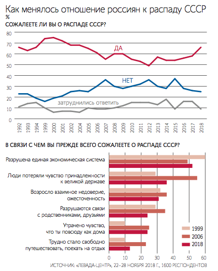 По данным социологов, 60% опрошенных граждан РФ считают, что распада можно было избежать, – это тоже максимум за 13 лет.