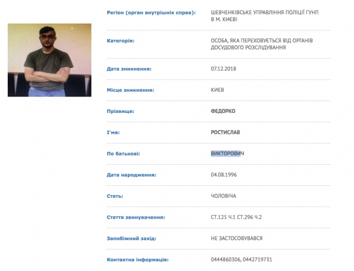 Как показывает розыскной файл на сайте МВД, Федорко находится в розыске.