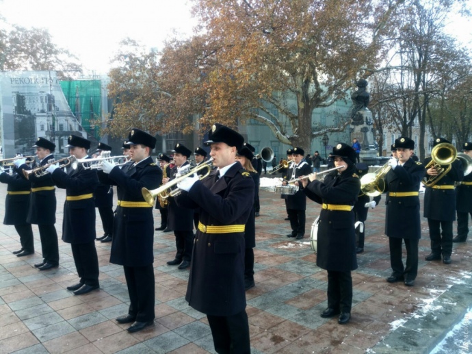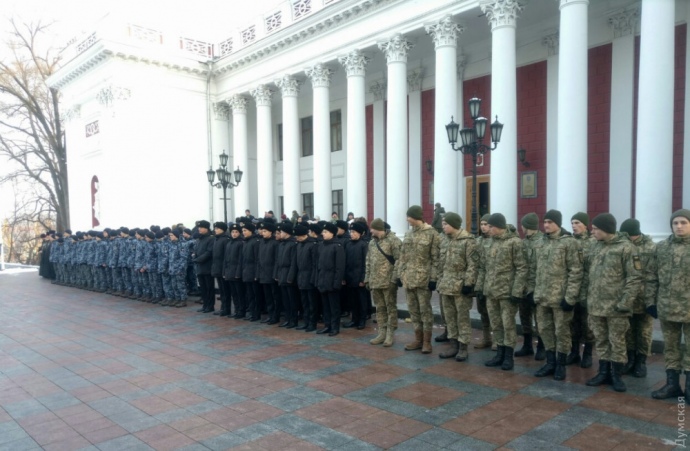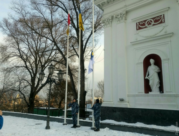 В воскресенье перед зданием Одесского горсовета на Думской площади подняли флаг Военно-морских сил Украины — в знак поддержки моряков, захваченных россиянами у берегов Крыма.