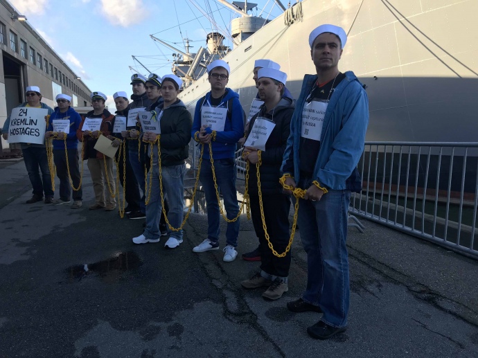 Как сообщили "Украинской правде" организаторы акции, 24 украинца в моряцком снаряжении, закованные в цепи, выстроились у военного корабля.