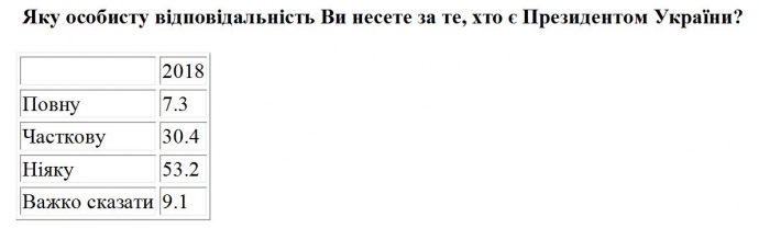 Согласно данным социологов, 53,2% граждан считают, что не несут никакой личной ответственности за то, кто является президентом Украины, еще 30,4% заявили, что их ответственность только частичная, 7,3% признали, что несут полную ответственность за избрание главы государства, и 9,1% затруднились ответить.