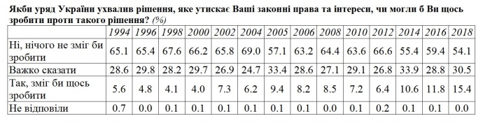 Также большинство украинцев (54,1%) убеждены, что ничего не могли бы поделать, если бы правительство страны приняло вредное для них решение. Противоположной точки зрения придерживаются только 15,4% граждан. Другие либо не ответили, либо затруднились с ответом.