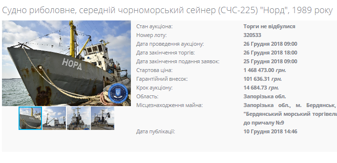 - Первые торги по продаже судна, которое украинские пограничники задержали с российским флагом на борту, не состоялись 7 ноября из-за отклонения заявок всех покупателей.