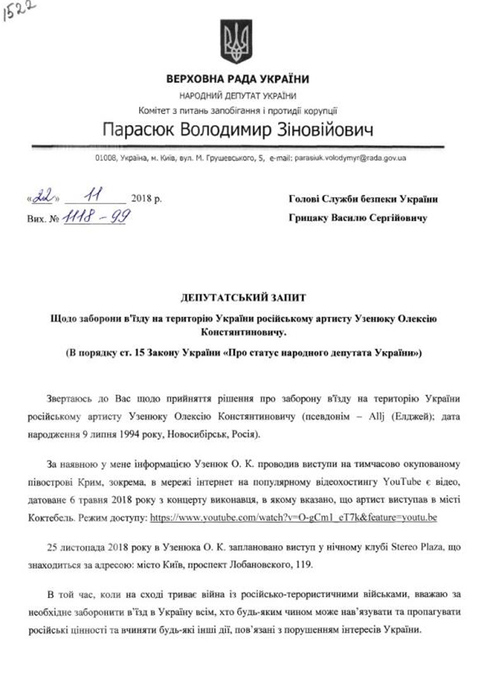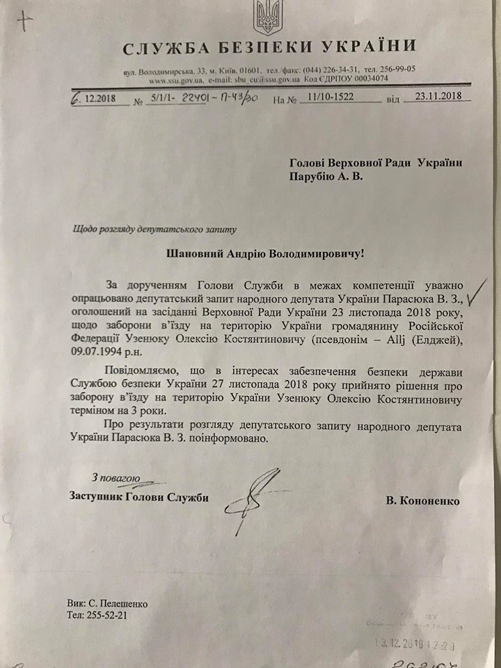 "В интересах обеспечения безопасности государства Службой безопасности Украины 27 ноября 2018 года было принято решение о запрете въезда на территорию Украины Узенюку Алексею Константиновичу (псевдоним Элджей - УП) сроком на 3 года", - говорится в ответе на запрос нардепа от СБУ.