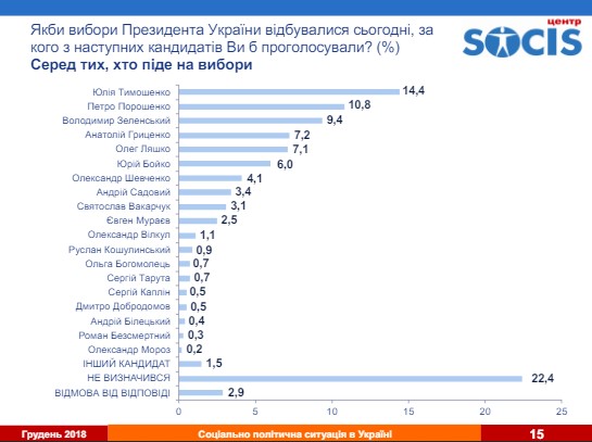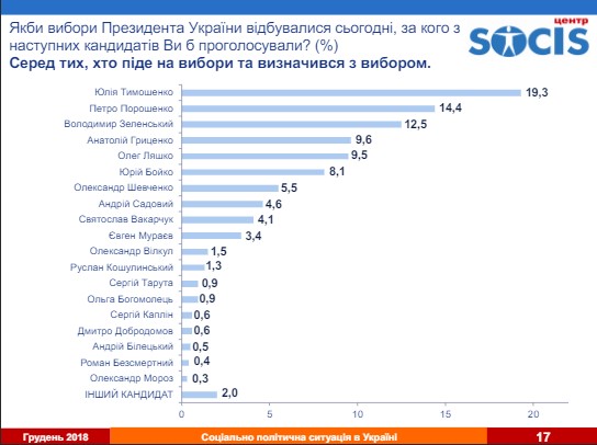 - По результатам декабрьского опроса Фонда "Демократические инициативы" и Центра Разумкова, Тимошенко поддерживают 16,1% тех, кто собирается участвовать в выборах президента, а Порошенко - 13,8%. На третьем месте актер Владимир Зеленский - 8,8%.