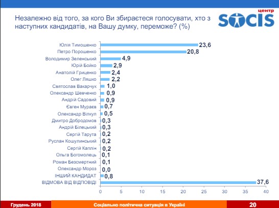 Вместе с тем, на вопрос "Независимо от того, за кого Вы собираетесь голосовать, кто из следующих кандидатов, по Вашему мнению, победит?" 23,6% опрошенных ответили, что победит Тимошенко, 20,8% - что Порошенко. Других кандидатов назвали менее 5% респондентов.