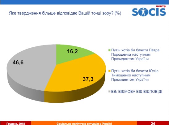 При этом 37,3% опрошенных согласились с мнением, что президент РФ Владимир Путин хотел бы видеть Юлию Тимошенко следующим президентом Украины. 16,2% считают, что Путин хотел бы видеть на этом посту Порошенко. 46,6% опрошенных отказались отвечать на эти вопросы.