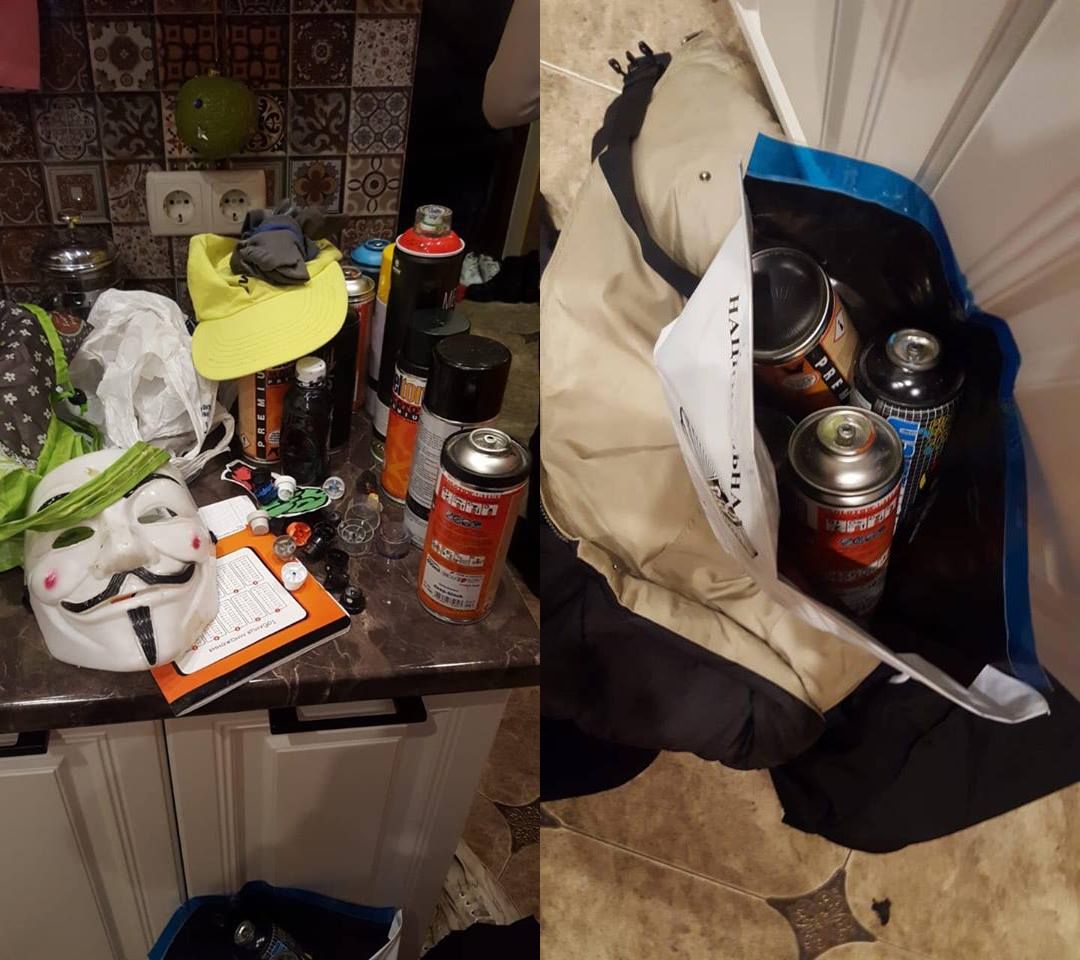 Во время обысков правоохранители изъяли у фигурантов дела баллоны с краской, маски, перчатки и другие вещественные доказательства.