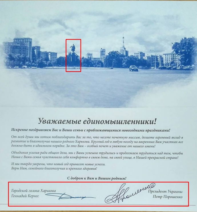 По данным автора материала, недавно в почтовые ящики харьковчан попали письма с поздравлениями с новогодними праздниками якобы от Кернеса и Порошенко.