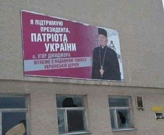 Согласно сообщению в Facebook, в городе Монастыриска Тернопольской области на стене дома вывесили билборд с изображением отца епархии Игоря Джиджоры, на котором он якобы "поддерживает патриота президента" и поздравляет соотечественников с предоставлением украинской церкви томоса.