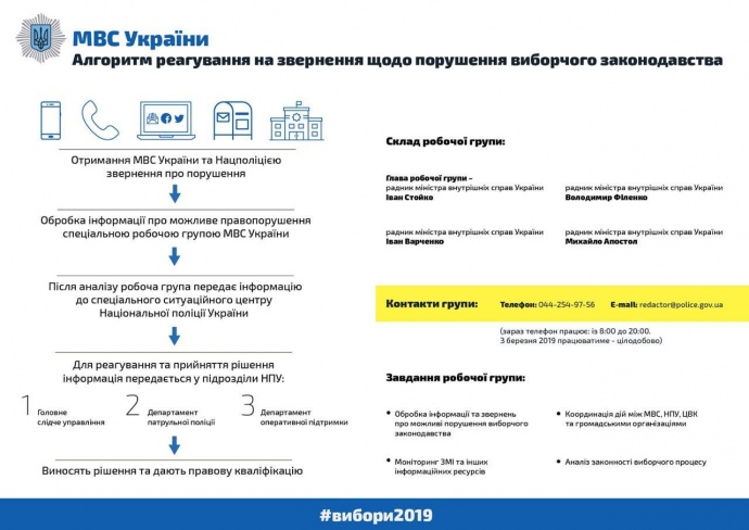 "Для всех, кто хочет проинформировать о фактах или подозрениях о нарушении избирательного процесса, сообщаю контакты нашей рабочей группы: Телефон: 044-254-97-56 (з 8-00 до 20-00, с 1 марта по 23 апреля – круглосуточно). Адрес: [email protected]", - написал он.