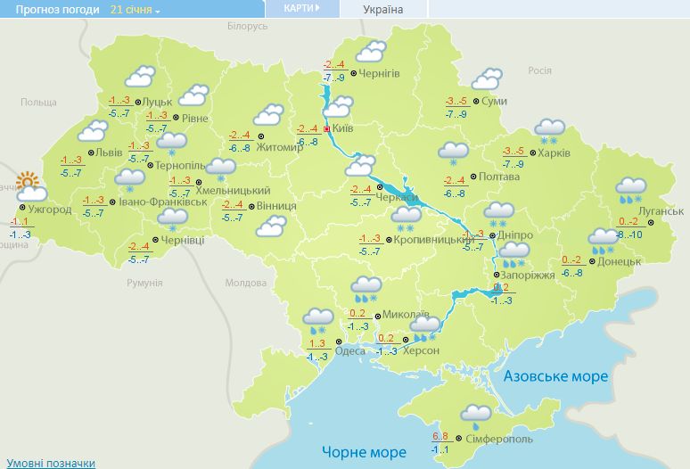 Днем 21 января на дорогах Украины – гололедица, в южной и восточной части местами налипание мокрого снега, гололед, в восточных областях местами значительные осадки.